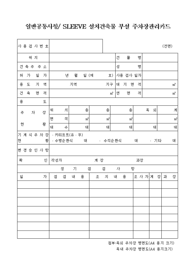 9,000원/월건축물부설주차장관리카드 입니다. 건축주 주소, 허가일자, 용도지역, 건축면적, 용도, 주차장 현황등으로 구성된 양식입니다.