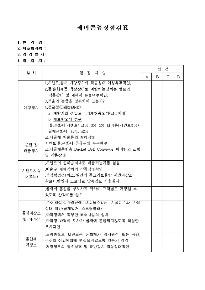 9,000원/월철근콘크리트공사,레미콘공장점검표 체크리스트 입니다. 점 검 사 항 1.시멘트,골재 계량장치의 작동상태 이상유무확인. 2.물.혼화제등 액상상태로 계량하는장치는 밸브의 작동상태 및 개폐시 유출여부확인. 3.저울의 눈금은 정위치에 있는가? 4.검교정(Calibration) a. 계량기의 정밀도 : 기계허용오차(±1.0이내) b. 재료량오차 범위 .물.혼화제.시멘트: ±1%. 3%. 2% 레미콘(시멘트;1%)골재혼화제: ±3%. ±2% 조.세골재 배출문의 개폐상태 시멘트.물.혼화제 공급관의 누수여부 조.세골재운반용 Bucket Belt Conveyor 베어링의 조립 및 작동상태 ...