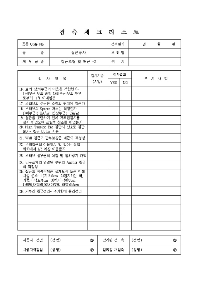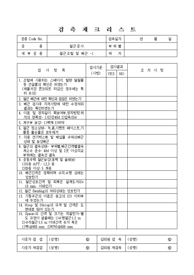 9,000원/월철근콘크리트공사,철근조립및배근 체크리스트 입니다. 검 사 항 목 1. 조립에 사용하는 스페이서, 발판 달철물 등 건설품의 확인은 하였는가 (제물치장 콘크리트 마감인 경우에는 특히 유의) 2. 철근 배근에 대한 확인과 점검은 하였는가 3. 배근 검사후 지적사항에 대한 수정처리결과는 확인하였는가 4. 이음 및 정착길이 확보여부,정착방향.위치의 정확성- 1)인장:40d 2)압축:25d 5. 개구부 보강- 1)벽체 2)바닥 6. 철근 청소상태- 녹,흙,시맨트 페이스트,기름등 불순물은 모두제거 7. 각종 전기박스류 및 매입물 주위의배근상태 및 보강배근 ...
