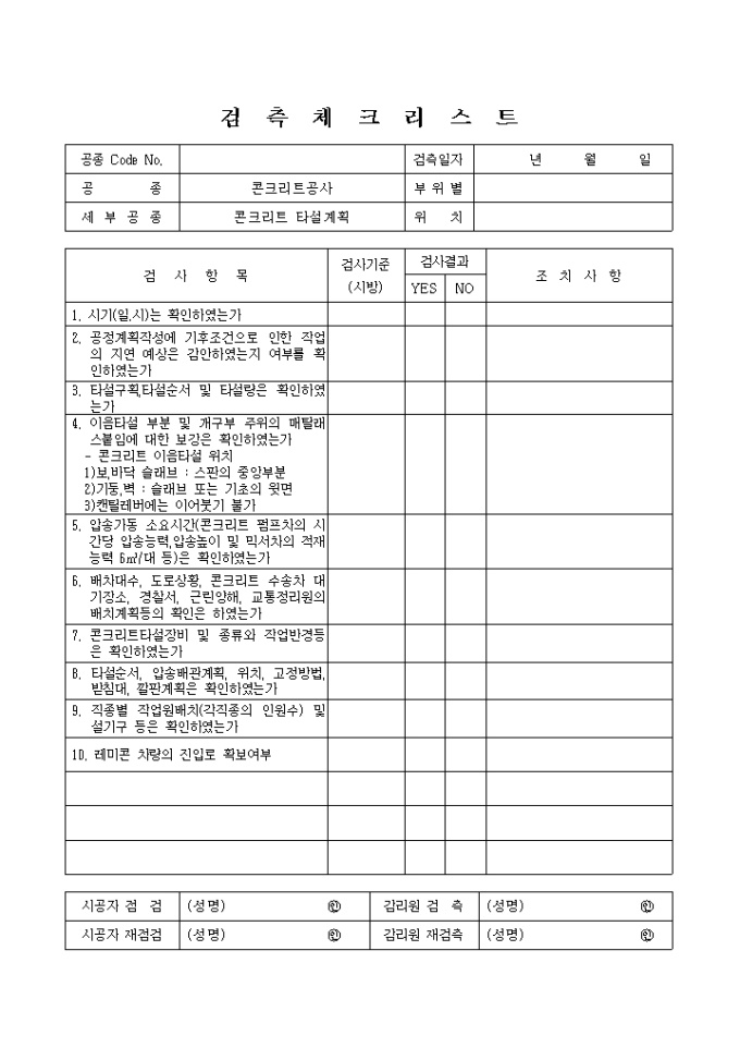 9,000원/월철근콘크리트공사,콘크리트타설계획 체크리스트 입니다. 검 사 항 목 1. 시기(일.시)는 확인하였는가 2. 공정계획작성에 기후조건으로 인한 작업의 지연 예상은 감안하였는지 여부를 확인하였는가 3. 타설구획,타설순서 및 타설량은 확인하였는가 4. 이음타설 부분 및 개구부 주위의 매탈래스붙임에 대한 보강은 확인하였는가 - 콘크리트 이음타설 위치 1)보,바닥 슬래브 : 스판의 중앙부분 2)기둥,벽 : 슬래브 또는 기초의 윗면 3)캔틸레버에는 이어붓기 불가 5. 압송가동 소요시간(콘크리트 펌프차의 시간당 압송능력,압송높이 및 믹서차의 적재능력 6㎥/대 등)은 확인하였는가 ...