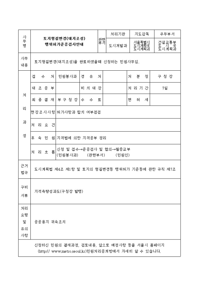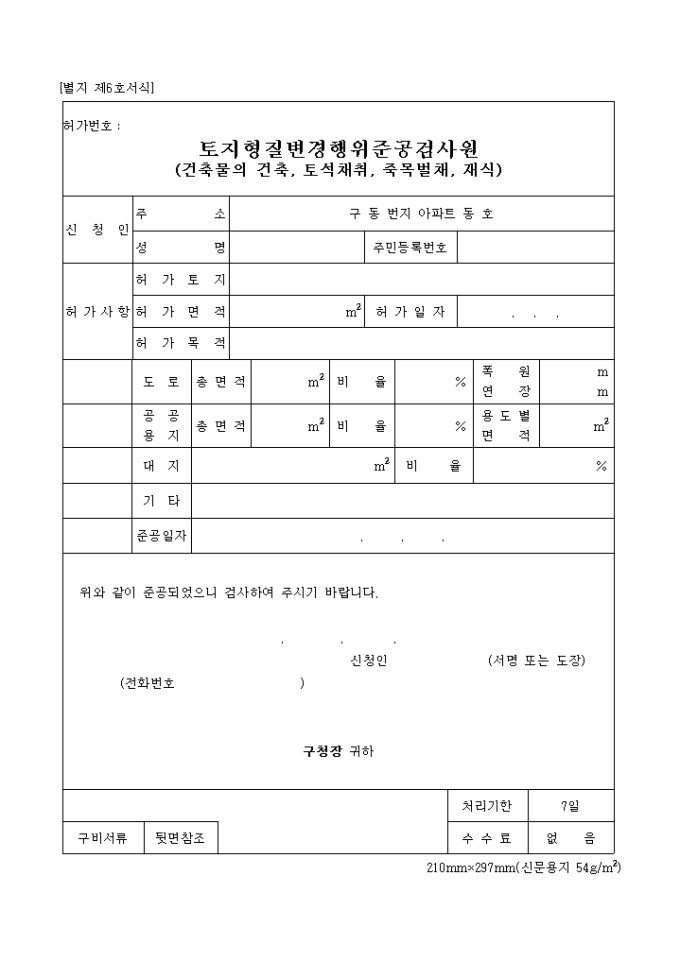 9,000원/월별지 제6호서식 토지형질변경(대지조성)을 완료하였을때 신청하는 민원사무 양식입니다.