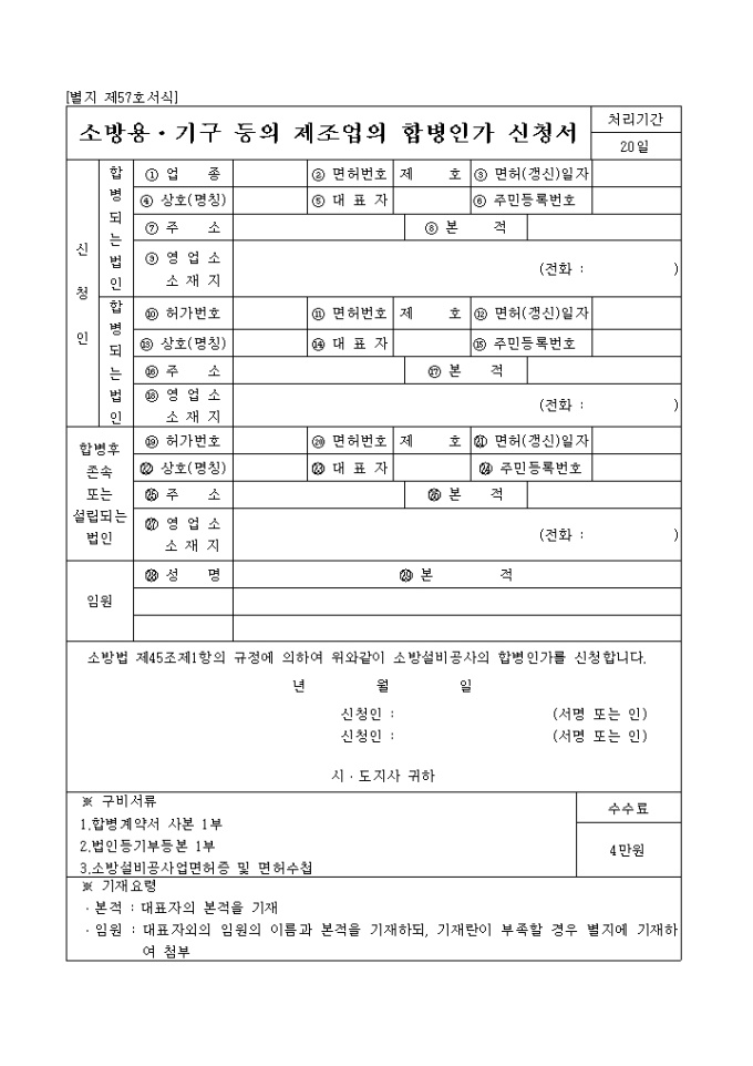 9,000원/월[별지 제57호서식] 소방법 제45조제1항의 규정에 의하여 소방설비공사의 합병인가를 신청할 때 사용하는 양식입니다.