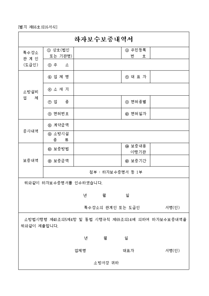 9,000원/월[별지 제66호의16서식] 소방법시행령 제40조의5제4항 및 동법 시행규칙 제69조의14에 의한 하자보수보증내역서 양식입니다.
