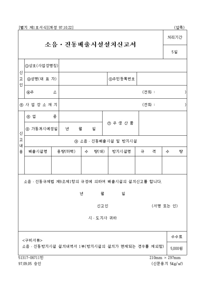 9,000원/월[별지 제1호서식] 소음 진동규제법 제9조제1항의 규정에 의하여 배출시설의 설치신고할 때 사용하는 양식입니다.