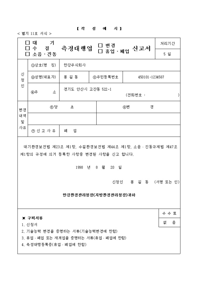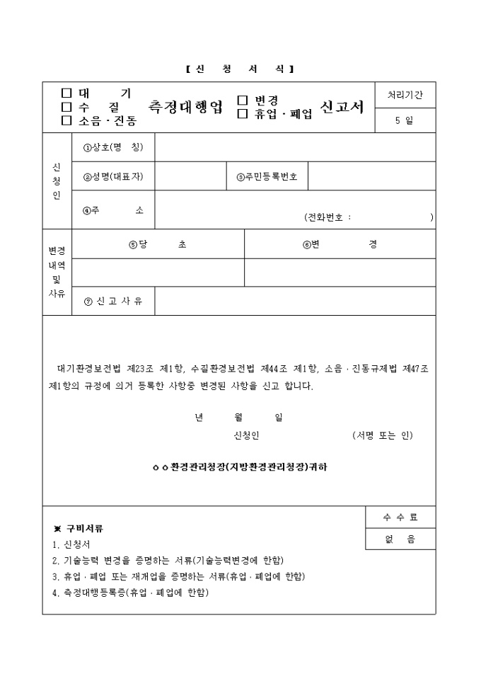 9,000원/월대기환경보전법 제23조 제1항, 수질환경보전법 제44조 제1항, 소음·진동규제법 제47조 제1항의 규정에 의거 등록한 사항중 변경된 사항을 신고 할 때 사용하는 양식입니다.