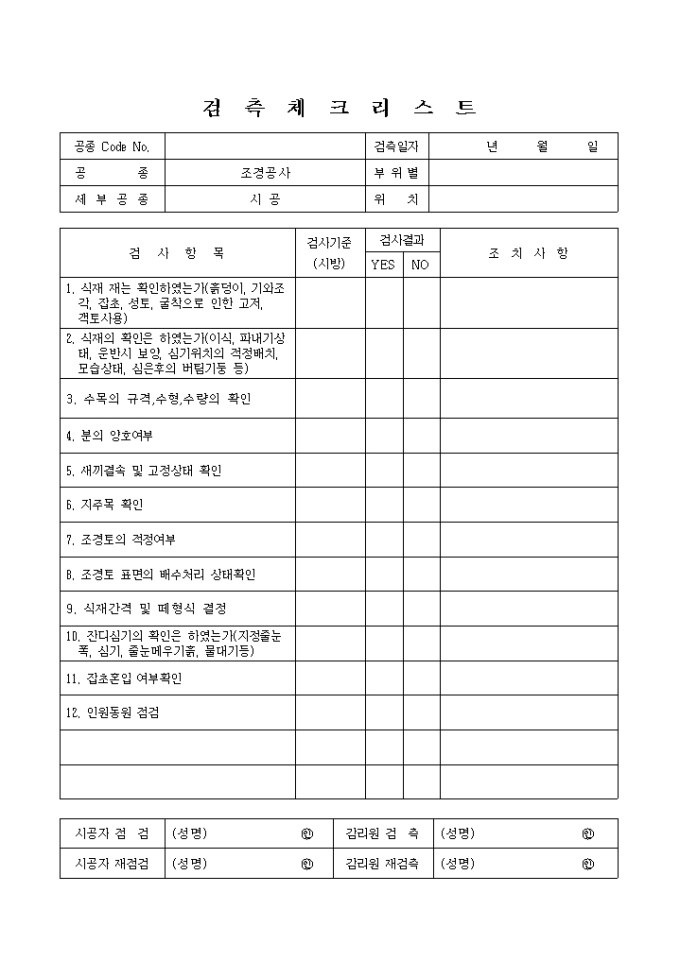 9,000원/월총칙,시공에 관한 체크리스트 양식입니다. 다음의 검사항목을 참고하세요. 1. 식재 재는 확인하였는가(흙덩이, 기와조각, 잡초, 성토, 굴착으로 인한 고저, 객토사용) 2. 식재의 확인은 하였는가(이식, 파내기상태, 운반시 보양, 심기위치의 적정배치, 모습상태, 심은후의 버팀기둥 등) 3. 수목의 규격,수형,수량의 확인 4. 분의 양호여부 ...