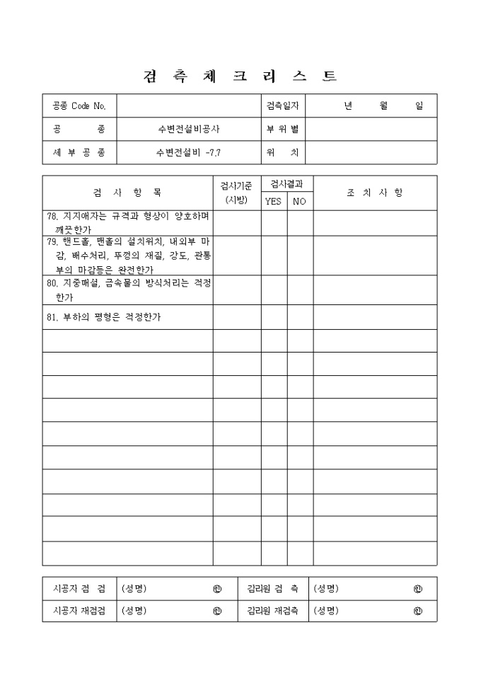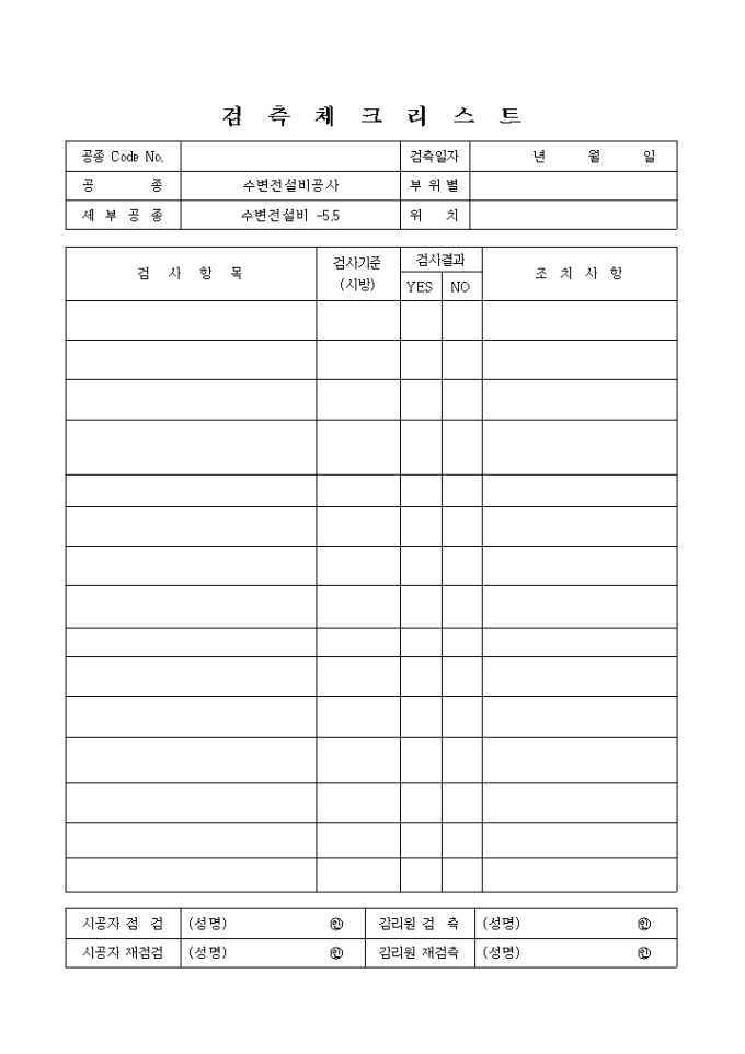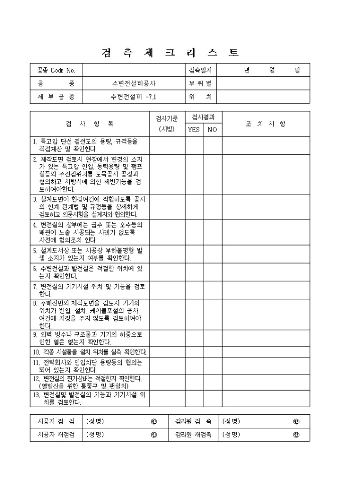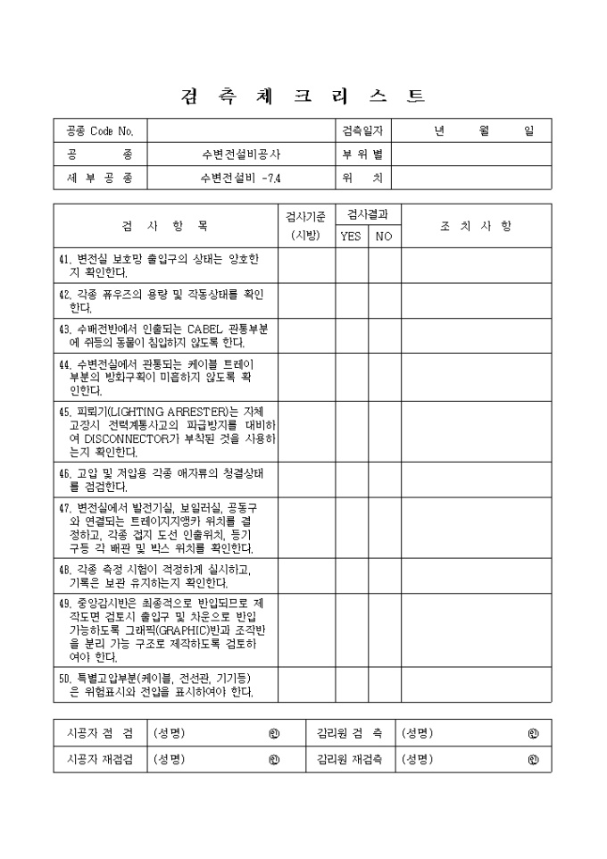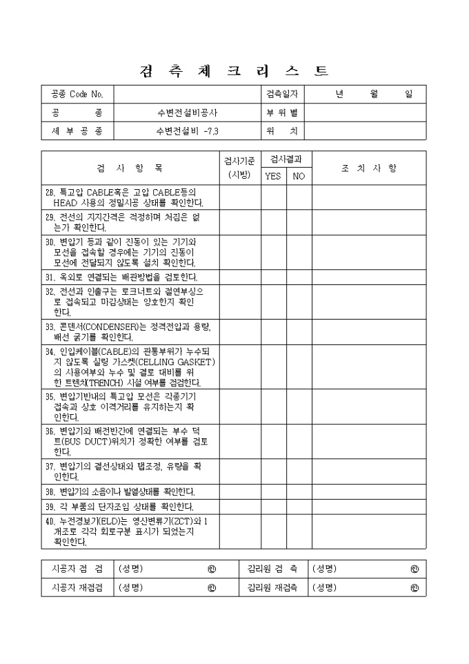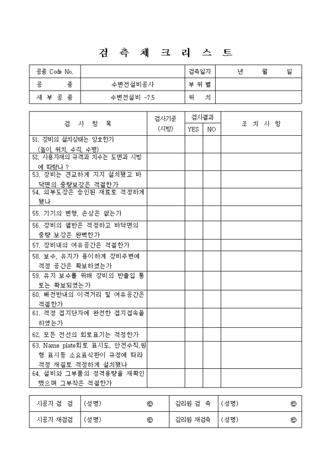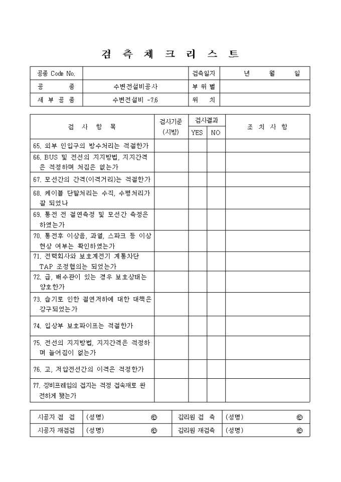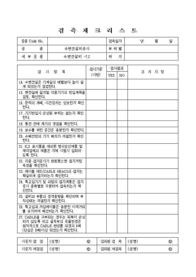 9,000원/월수변전설비공사,수변전설비① 체크리스트 입니다. 검 사 항 목 1. 특고압 단선 결선도의 용량, 규격등을 직접계산 및 확인한다. 2. 제작도면 검토시 현장에서 변경의 소지가 있는 특고압 인입, 동력용량 및 펌프실등의 수전점위치를 토목공사 공정과 협의하고 시방서에 의한 제반기능을 검토하여야한다. 3. 설계도면이 현장여건에 적합하도록 공사의 한계 관계법 및 규정등을 상세하게 검토하고 의문사항을 설계자와 협의한다. 4. 변전실의 상부에는 급수 또는 오수등의 배관이 노출 시공되는 사례가 없도록 사전에 협의조치 한다. ...