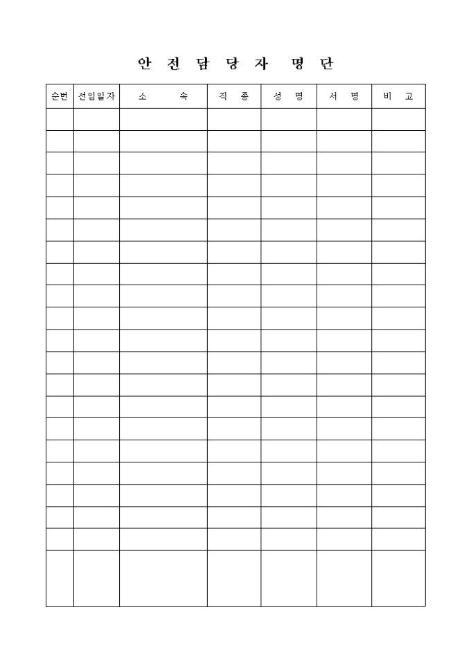 9,000원/월안전담당자명단서식 입니다. 순번, 선임일자, 소속, 직종, 성명, 서명, 비고의 항목으로 구성된 양식입니다.