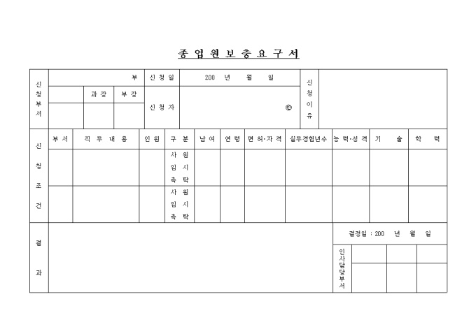 9,000원/월종업원보충지원요구서 입니다. 신청부서, 신청조건, 결과등의 세부 항목으로 구성된 양식입니다.