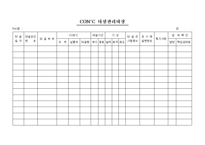 9,000원/월콘크리트타설관리대장 입니다. 타설일자, 타설승인번호, 타설부위, CON´C, 타설시간, 기상, 타설 전 시험 횟수등의 항목으로 구성된 양식입니다.