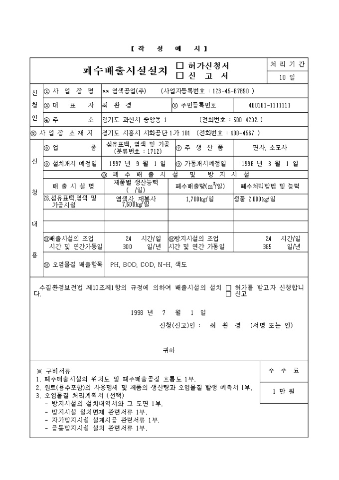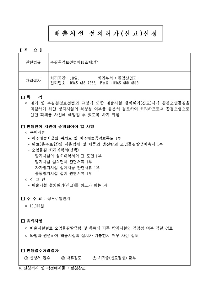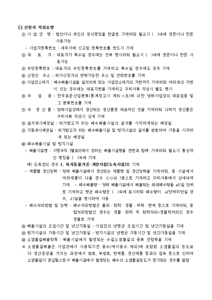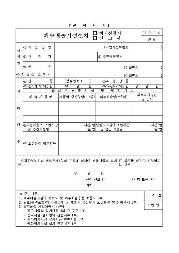 9,000원/월수질환경보전법 제10조제1항의 규정에 의하여 배출시설의 설치 허가를 받고자 신청할 때 사용하는 양식입니다.