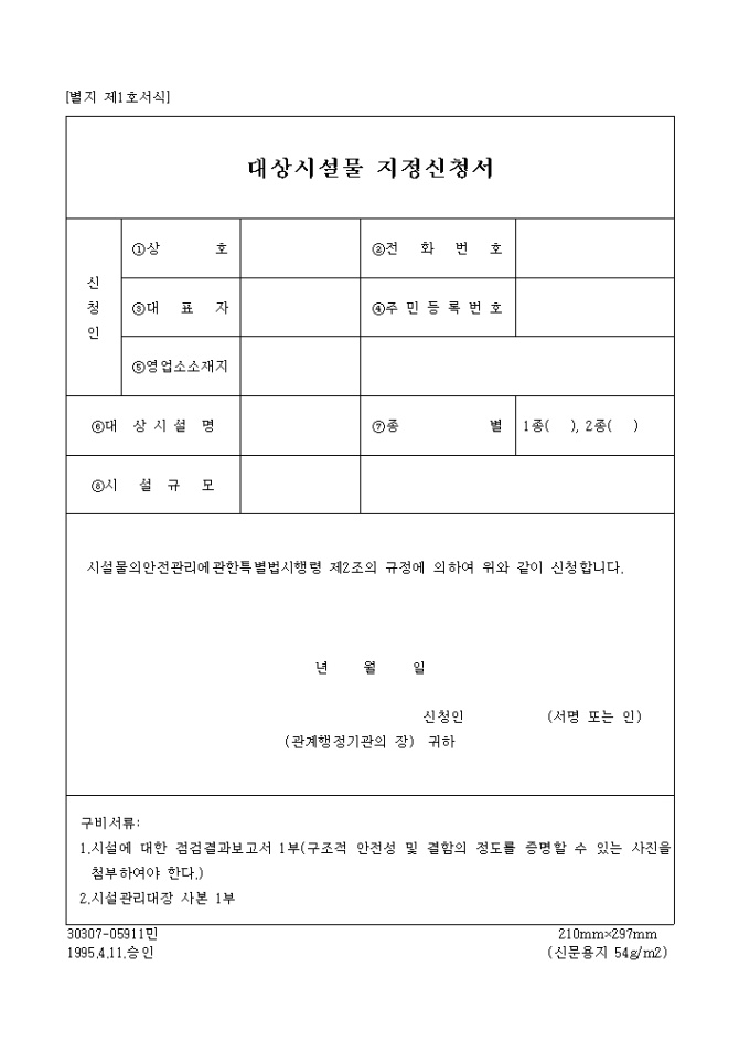 9,000원/월[별지 제1호서식] 시설물의안전관리에 관한 특별법시행령 제2조의 규정에 의하여 대상시설물을 지정 신청할 때 사용하는 양식입니다.