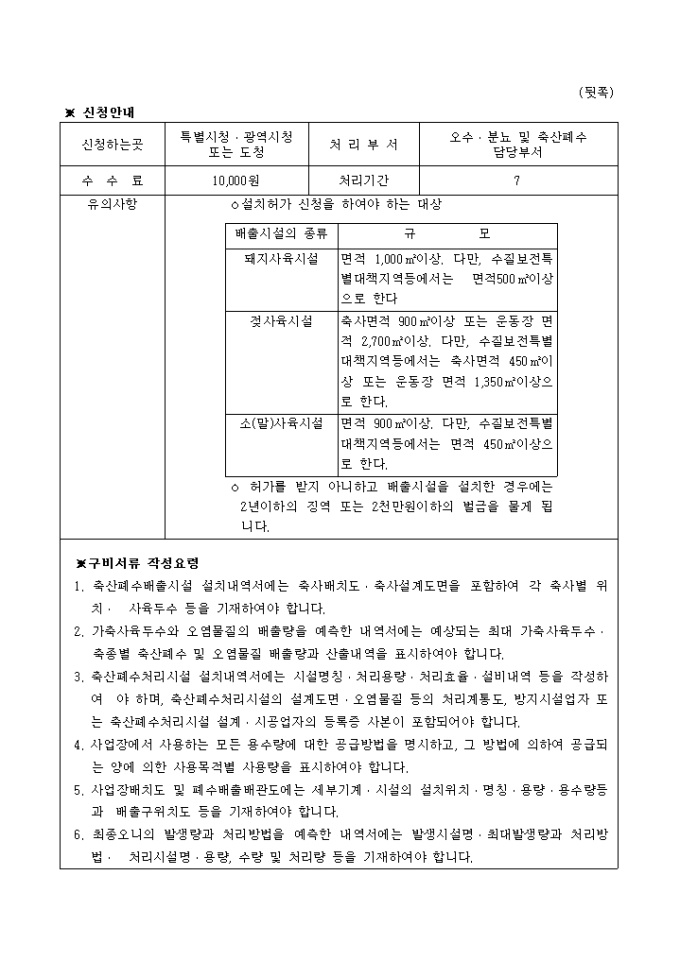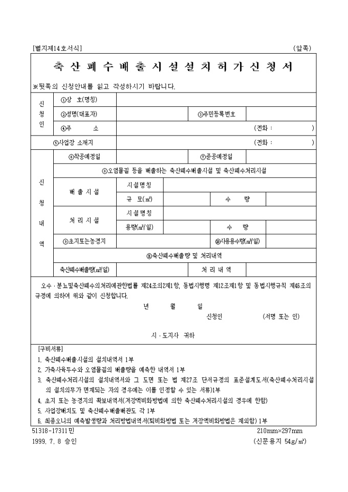 9,000원/월[별지제14호서식] 오수·분뇨 및 축산폐수의처리에 관한 법률 제24조의2제1항, 동법시행령 제12조제1항 및 동법시행규칙 제46조의 규정에 의하여 축산폐수배출 시설을 설치허가 신청할 때 사용하는 양식입니다.
