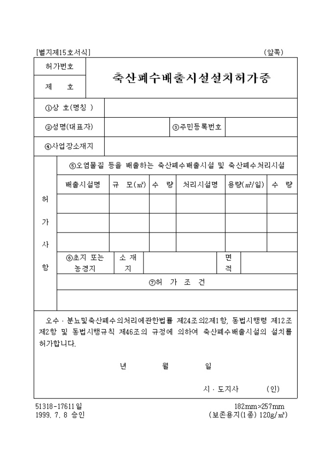 9,000원/월[별지제15호서식] 오수, 분뇨 및 축산폐수의처리에 관한 법률 제24조의2제1항, 동법시행령 제12조제2항 및 동법시행규칙 제46조의 규정에 의하여 축산폐수배출시설의 설치를 허가할 때 사용하는 양식입니다.