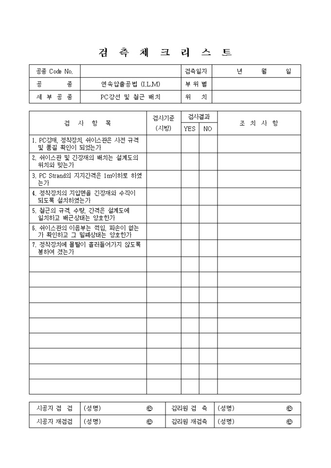 9,000원/월일반사항,연속압출공법(I.L.M),PC강선및철근배치 검측 체크 리스트입니다. 검 사 항 목 1. PC강재, 정착장치, 쉬이스관은 사전 규격 및 품질 확인이 되었는가 2. 쉬이스관 및 긴장재의 배치는 설계도의 위치와 맞는가 3. PC Strand의 지지간격은 1m이하로 하였는가 4. 정착장치의 지압면을 긴장재와 수직이 되도록 설치하였는가 .................