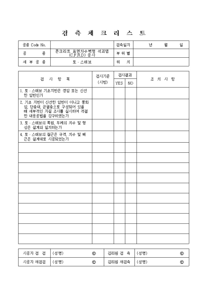 9,000원/월일반사항,콘크리트표면차수벽석괴댐(C.F.R.D)공사,토스래브 검측 체크 리스트입니다. 검 사 항 목 1. 토․스래브 기초지반은 경암 또는 신선한 암반인가 2. 기초 지반이 신선한 암반이 아니고 풍화암, 단충대, 균열충으로 구성되어 있을때 세부적인 지질 조사를 실시하여 적절한 내응공법을 강구하였는가 3. 토․스래브의 폭원, 두께의 치수 및 형상은 설계와 일치하는가 4. 토․스래브의 철근은 규격, 치수 및 배근은 설계대로 시공되었는가