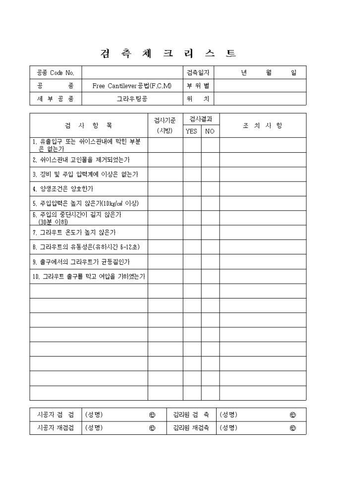 일반사항,FreeCantilever공법(F.C.M),그라우팅공 검측 체크리스트입니다. 검 사 항 목 1. 유출입구 또는 쉬이스관내에 막힌 부분은 없는가 2. 쉬이스관내 고인물을 제거되었는가 3. 장비 및 주입 압력계에 이상은 없는가 4. 양생조건은 양호한가