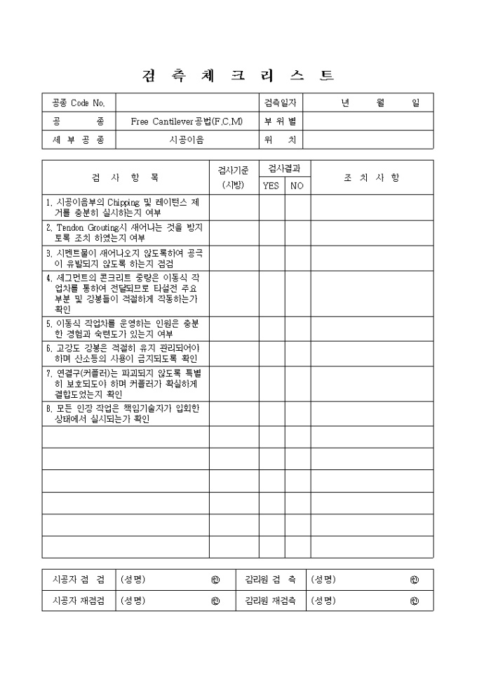 9,000원/월일반사항,FreeCantilever공법(F.C.M),시공이음 검측 체크리스트 입니다. 검 사 항 목 1. 시공이음부의 Chipping 및 레이턴스 제거를 충분히 실시하는지 여부 2. Tendon Grouting시 새어나는 것을 방지토록 조치 하였는지 여부 3. 시멘트물이 새어나오지 않도록하여 공극이 유발되지 않도록 하는지 점검 .....................