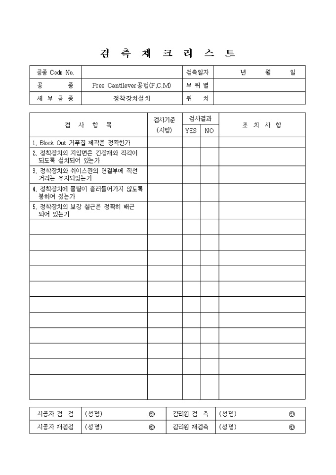 9,000원/월일반사항,FreeCantilever공법(F.C.M),정착장치설치② 검측 체크 리스트입니다. 검 사 항 목 1. Block Out 거푸집 제작은 정확한가 2. 정착장치의 지압면은 긴장재와 직각이 되도록 설치되어 있는가 3. 정착장치와 쉬이스관의 연결부에 직선거리는 유지되었는가 4. 정착장치에 몰탈이 흘러들어가지 않도록봉하여 졌는가 5. 정착장치의 보강 철근은 정확히 배근되어 있는가