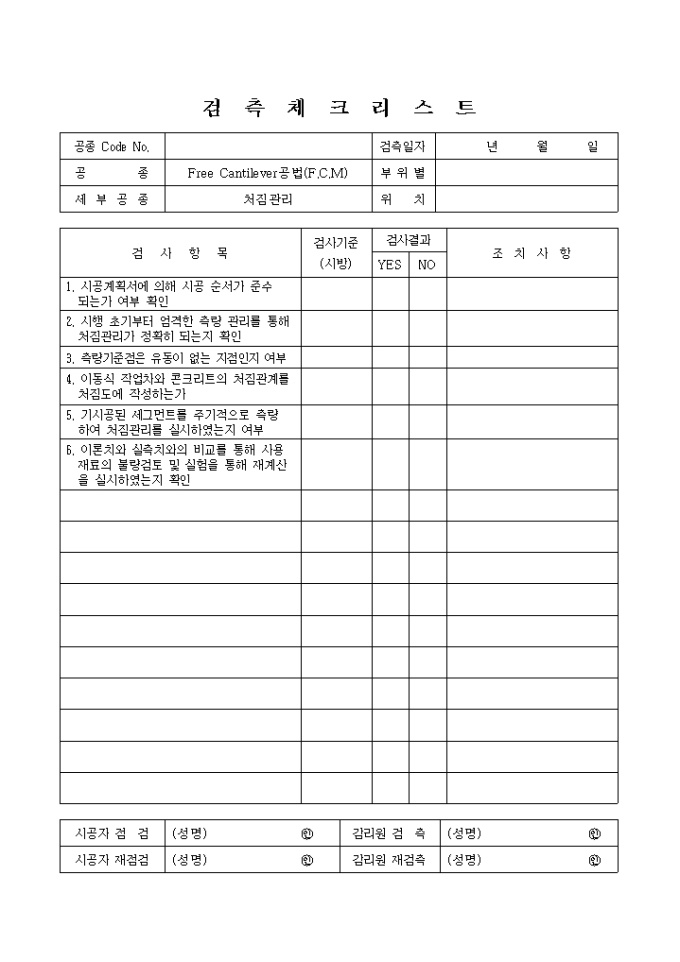 9,000원/월일반사항,FreeCantilever공법(F.C.M),처짐관리 검측 체크 리스트입니다. 검 사 항 목 1. 시공계획서에 의해 시공 순서가 준수되는가 여부 확인 2. 시행 초기부터 엄격한 측량 관리를 통해처짐관리가 정확히 되는지 확인 3. 측량기준점은 유동이 없는 지점인지 여부 4. 이동식 작업차와 콘크리트의 처짐관계를처짐도에 작성하는가 ...........................