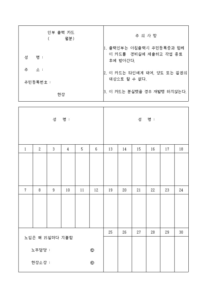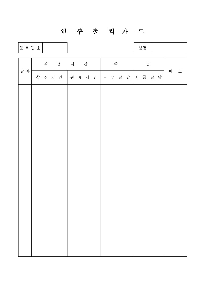 9,000원/월날자별 작업 착수시간, 완료시간을 기록하는 전기관련-인부출력카드입니다.