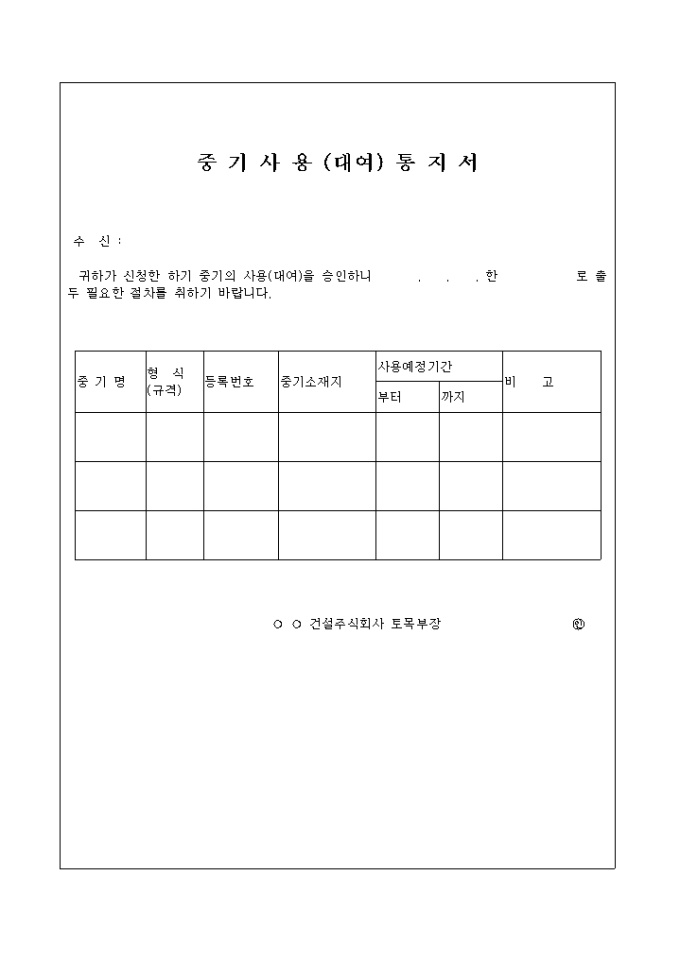 9,000원/월중기명, 형식, 등록번호, 중기소재지, 사용예정기간을 기록한 전기관련-중기사용(대여)통지서입니다.