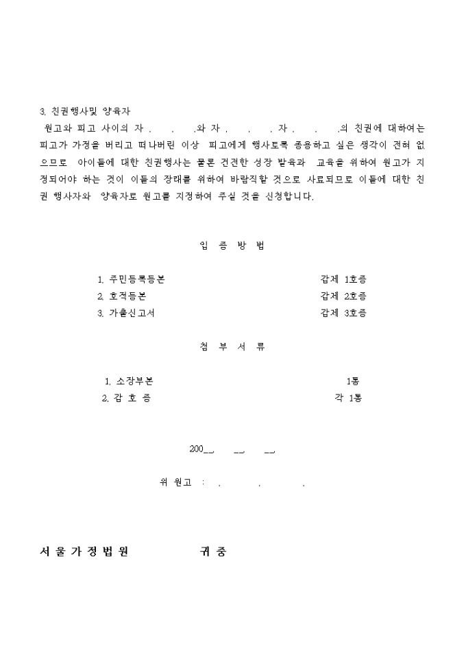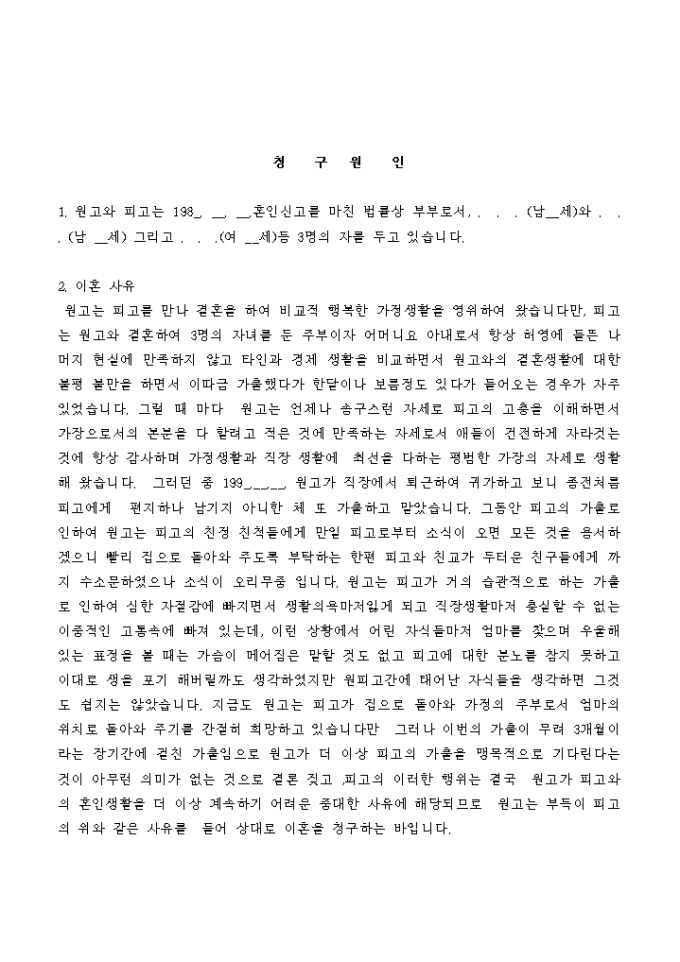 9,000원/월이혼소장 입니다. 청 구 취 지 1. 원고와 피고는 이혼한다. 2. 원고와 피고 사이의 자 . . .(_ _ _ _ _ _-_ _ _ _ _ _ _) 같은 자 . . .(_ _ _ _ _ _ - _ _ _ _ _ _) 같은 자 . . .(_ _ _ _ _ _-_ _ _ _ _ _ _)의 친권행사 및 양육자로 원고를 지정한다. 3. 소송비용은 피고의 부담으로 한다. 라는 판결을