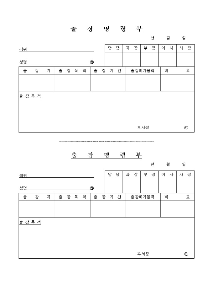 9,000원/월출장지, 출장목적, 출장기간등으로 구성된 출장명령부 양식입니다.