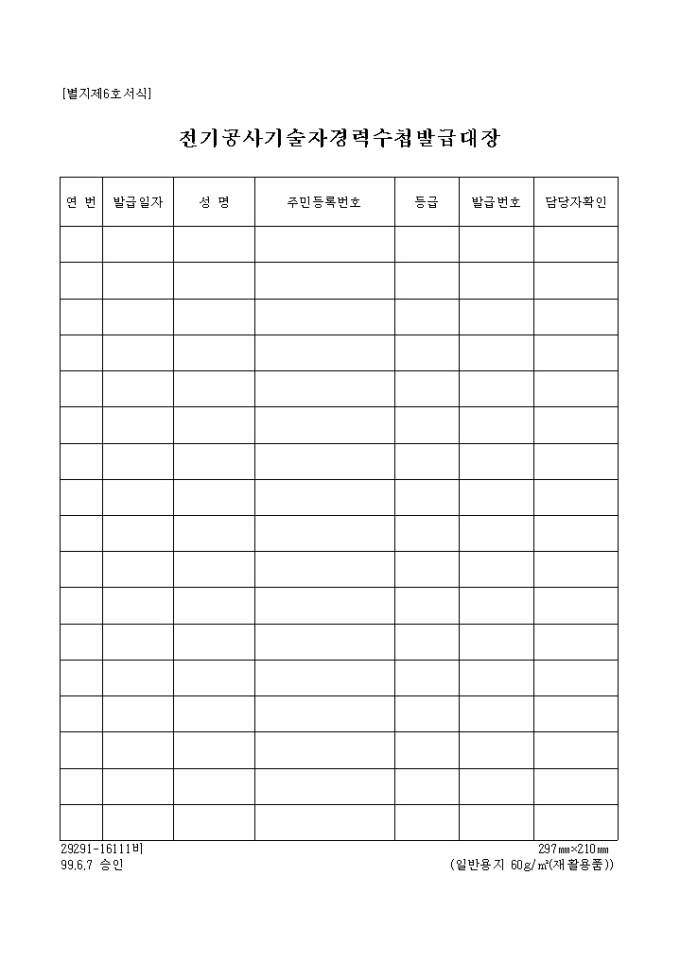 9,000원/월[별지제6호서식] 발급일자, 성명, 주민등록번호, 등급등으로 구성되어 있는 전기공사기술자경력수첩발급대장 양식입니다.