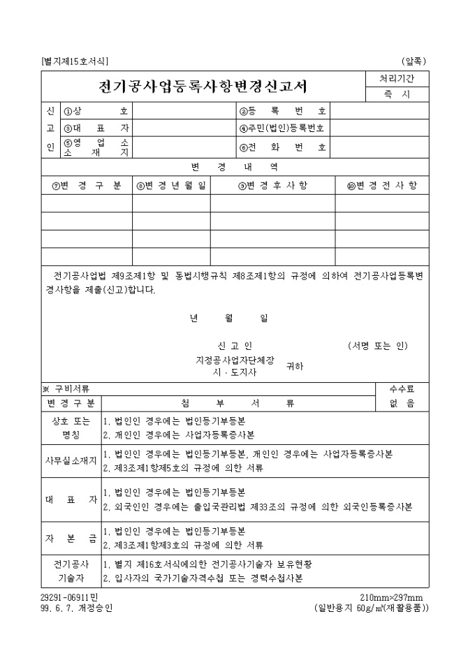 9,000원/월[별지제15호서식] 전기공사업법 제9조제1항 및 동법시행규칙 제8조제1항의 규정에 의하여 전기공사업등록변경사항을 제출(신고)할 때 사용하는 양식입니다.