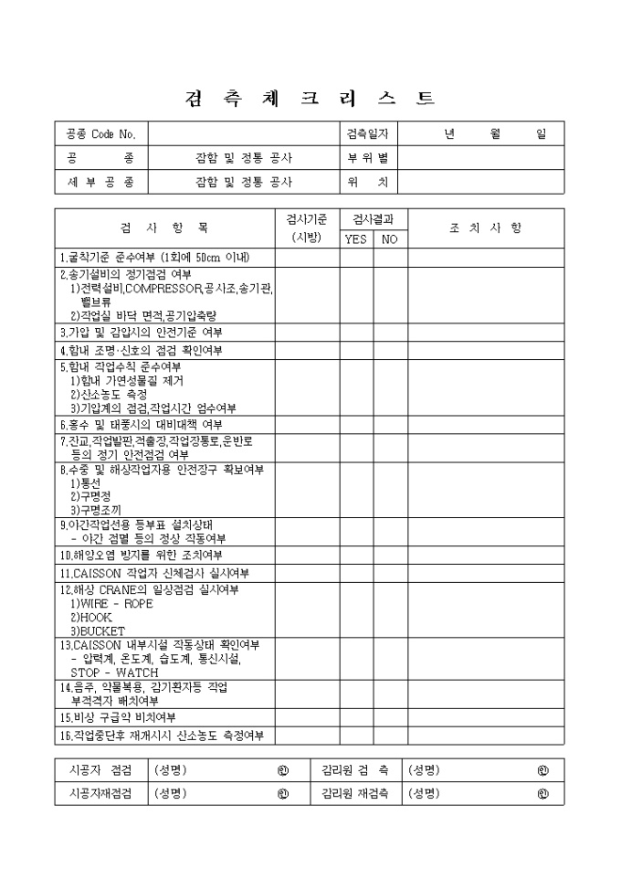 9,000원/월토목공사,잠함및정통공사① 체크리스트 입니다. 검 사 항 목 1.굴착기준 준수여부 (1회에 50cm 이내) 2.송기설비의 정기점검 여부 1)전력설비,COMPRESSOR,공사조,송기관,밸브류 2)작업실 바닥 면적,공기압축량 3.가압 및 감압시의 안전기준 여부 4.함내 조명 신호의 점검 확인여부 5.함내 작업수칙 준수여부 1)함내 가연성물질 제거 2)산소농도 측정 3)기압계의 점검,작업시간 엄수여부 ...