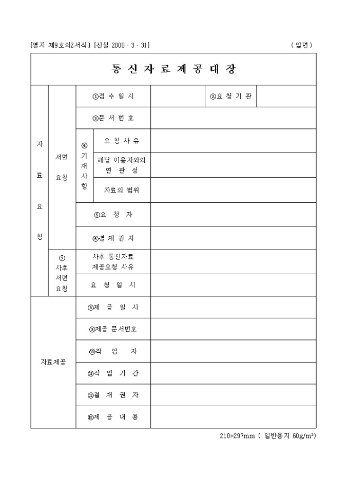 9,000원/월[별지 제9호의2서식] 요청사유, 해당 이용자와의 연관성, 자료의 범위, 요청자, 결재권자, 사후서면요청등으로 구성되어 있는 통신자료제공대장 양식입니다.
