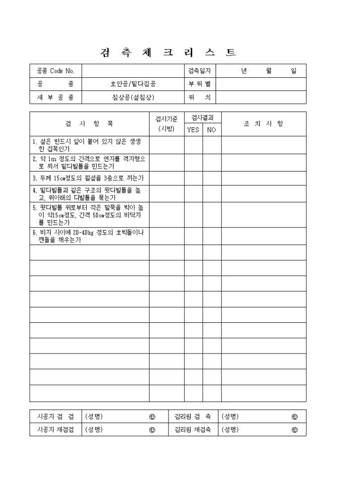 9,000원/월하천공사,호안공-밑다짐공,침상공(섶) 검측 체크리스트입니다. 검 사 항 목 1. 섶은 반드시 잎이 붙어 있지 않은 생생한 잡목인가 2. 약 1m 정도의 간격으로 연자를 격자형으로 짜서 밑다발틀을 만드는가 3. 두께 15㎝정도의 깔섶을 3층으로 까는가 4. 밑다발틀과 같은 구조의 윗다발틀을 높고, 위아래의 다발틀을 묶는가 .......................