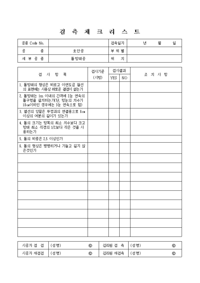 9,000원/월하천공사,호안공-비탈덮기,돌망태공 검측 체크 리스트입니다. 검 사 항 목 1. 돌망태의 형상은 바르고 아연도금 철선의 표면에는 사용상 해로운 결점이 없는가 2. 돌망태는 1m 이내의 간격에 2눈 연속의 돌구멍을 설치하는가(단, 망눈의 치수가 10㎝이하인 경우에는 3눈 연속으로 함) 3. 열선의 양끝은 뚜껑과의 연결용으로 6㎝이상의 여분의 길이가 있는가 4. 돌의 크기는 망목의 최소 치수보다 크고 망태 최소 직경의 1/2보다 작은 것을 사용하는가 ......................