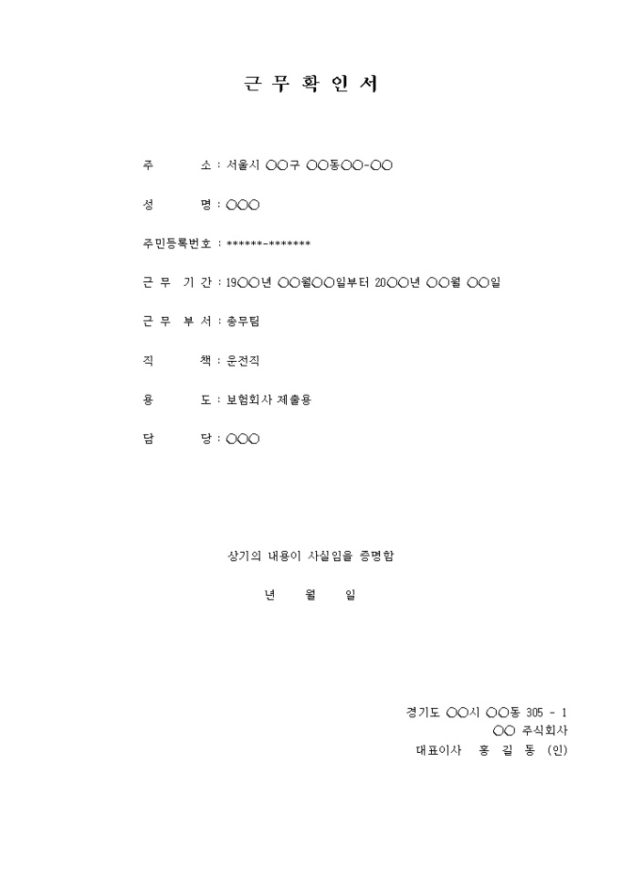 9,000원/월해당인이 회사에 근무함을 증명 확인하는 양식입니다. 주소, 성명, 주민등록번호, 근무기간, 근무부서, 직책, 용도, 담당등의 내용을 기술하도록 되어 있습니다.