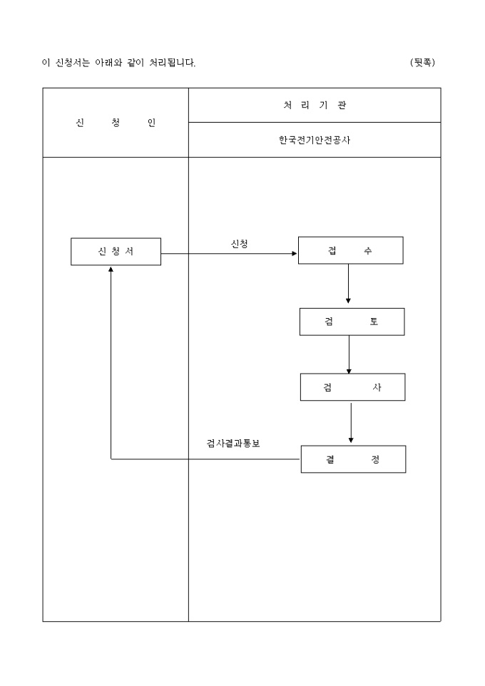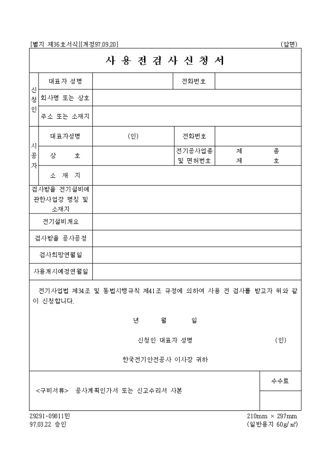 9,000원/월[별지 제36호서식] 전기사업법 제34조 및 동법시행규칙 제41조 규정에 의하여 사용 전 검사를 받고자 신청할 때 사용하는 양식입니다.