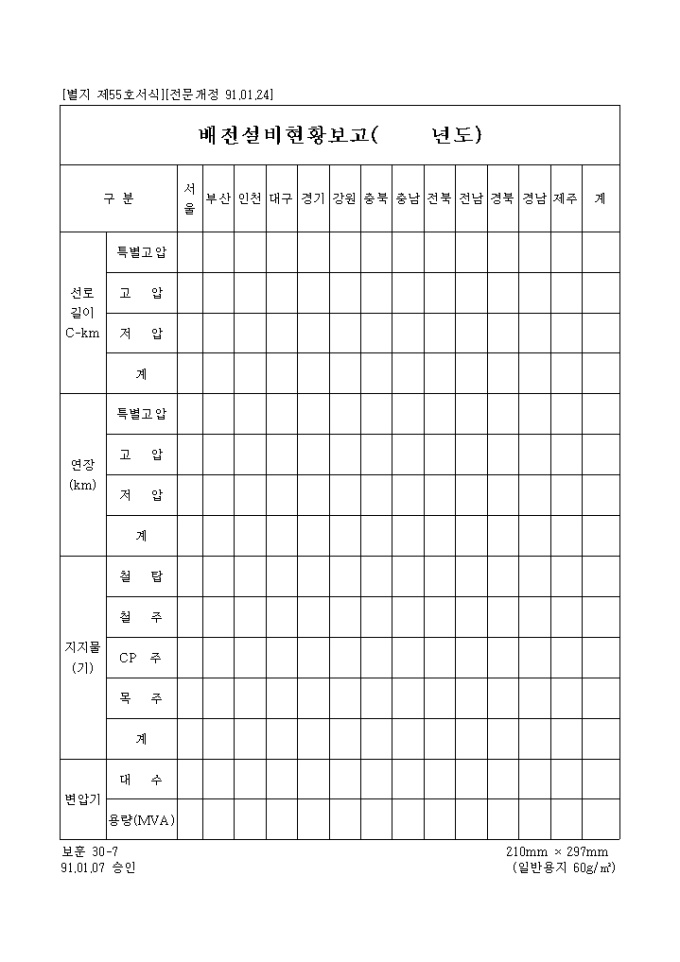 9,000원/월[별지 제55호서식] 선로길이, 연장, 지지물, 변압기를 각 지역별로 기록하는 배전설비현황보고 양식입니다.