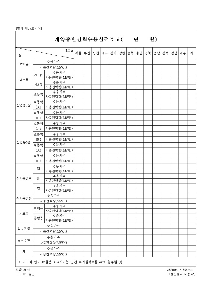 9,000원/월[별지 제57호서식] 전력을 업무용, 산업용, 농사용, 가로등, 임시전등을 지역별로 기록하는 계약종별 전력수용 실적 보고 양식입니다.