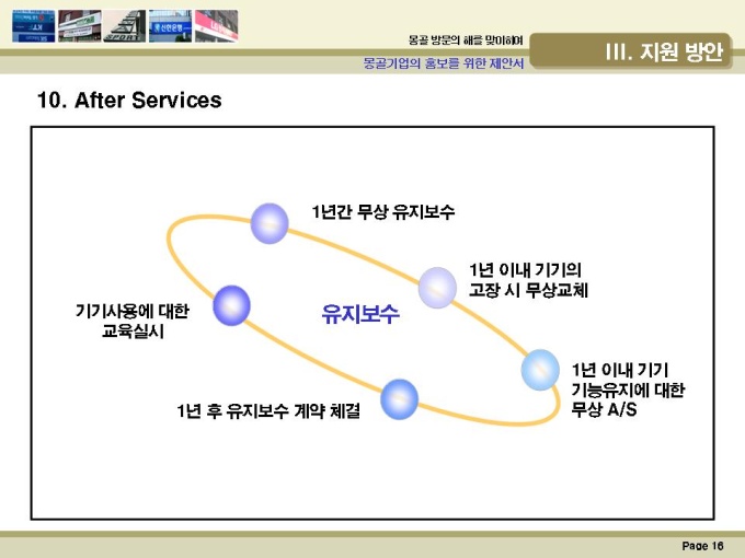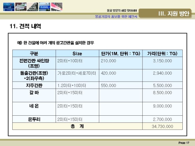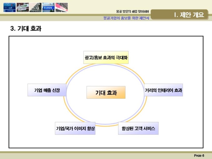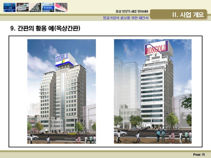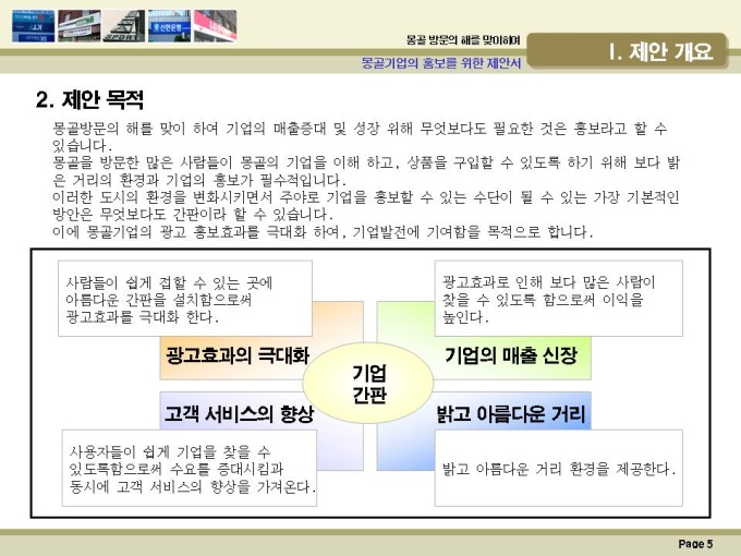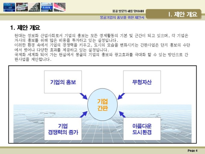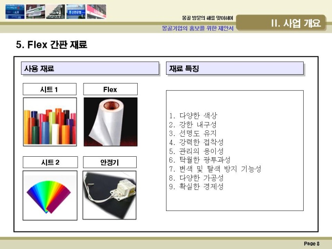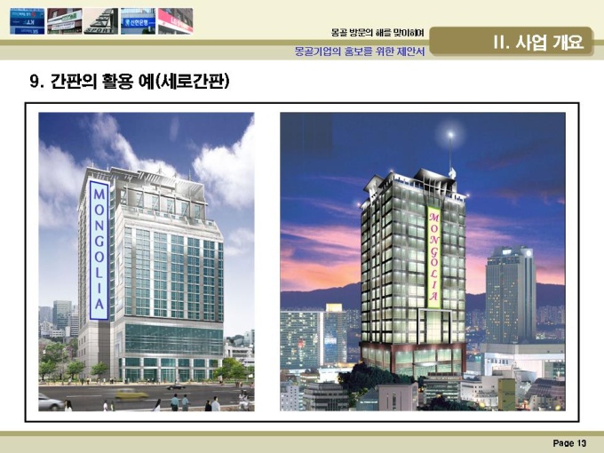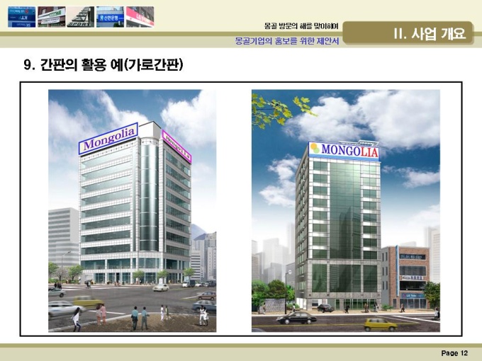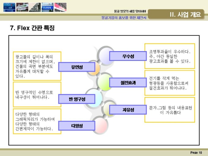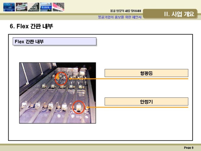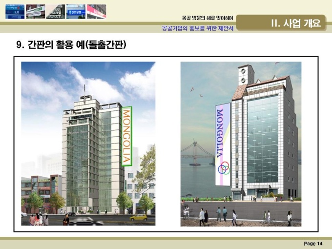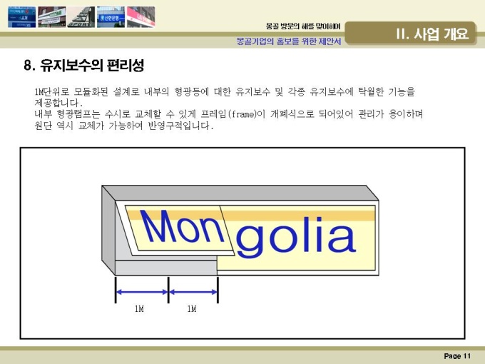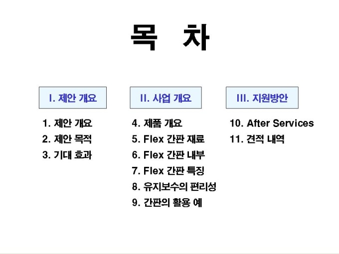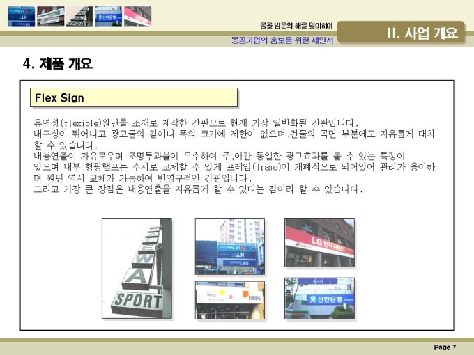 I. 제안 개요 1. 제안 개요 2. 제안 목적 3. 기대 효과 II. 사업 개요 4. 제품 개요 5. Flex 간판 재료 6. Flex 간판 내부 7. Flex 간판 특징 8. 유지보수의 편리성 9. 간판의 활용 예 III. 지원방안 10. After Services 11. 견적 내역 몽골간판제안서 양식입니다.