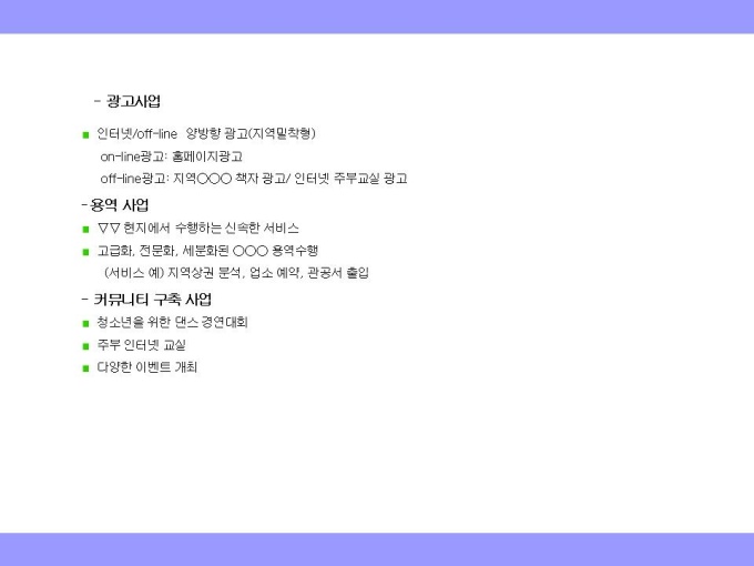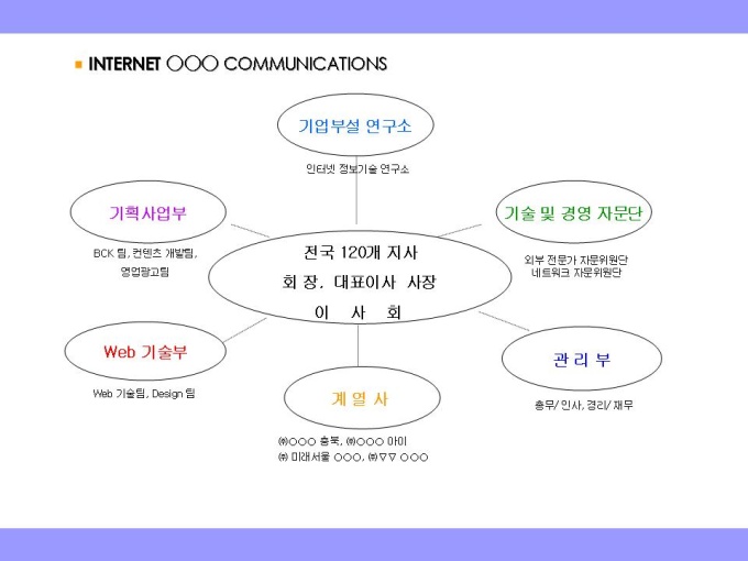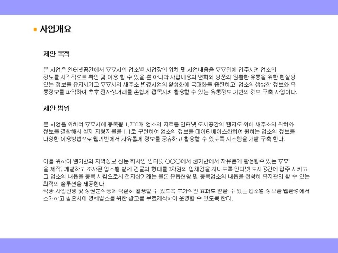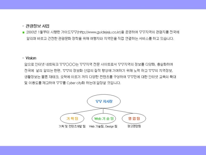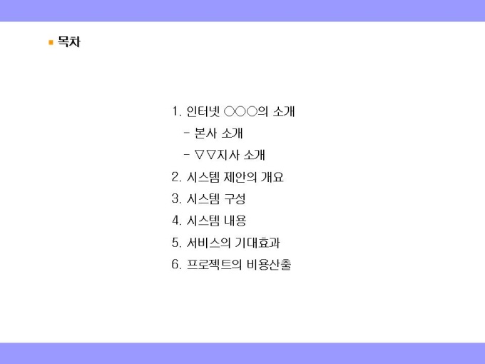 1. 인터넷 ○○○의 소개 - 본사 소개 - ▽▽지사 소개 2. 시스템 제안의 개요 3. 시스템 구성 4. 시스템 내용 5. 서비스의 기대효과 6. 프로젝트의 비용산출 제주시청 사업제안서 양식입니다.