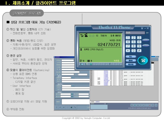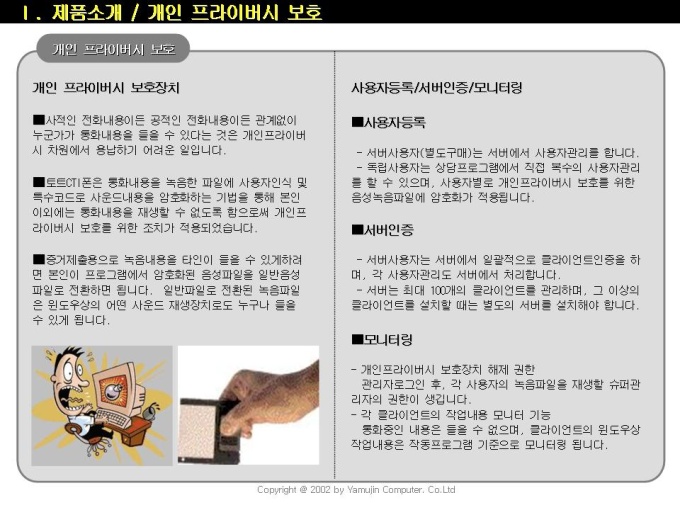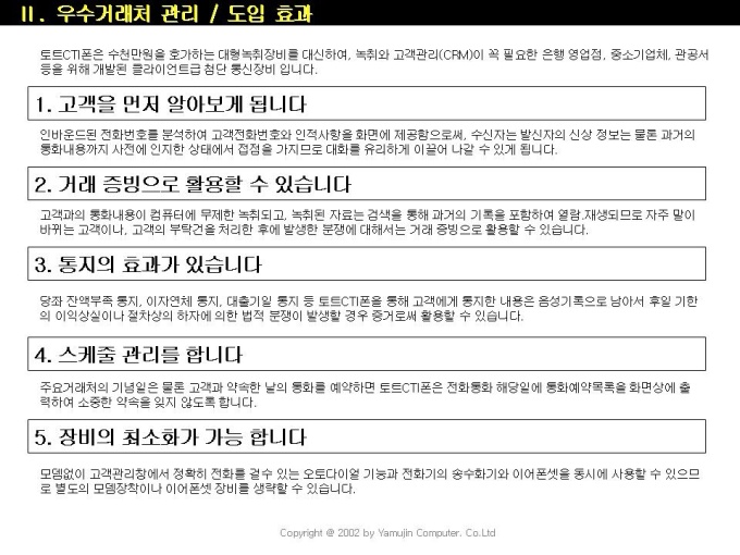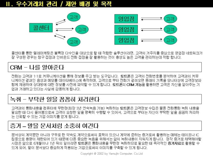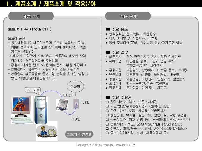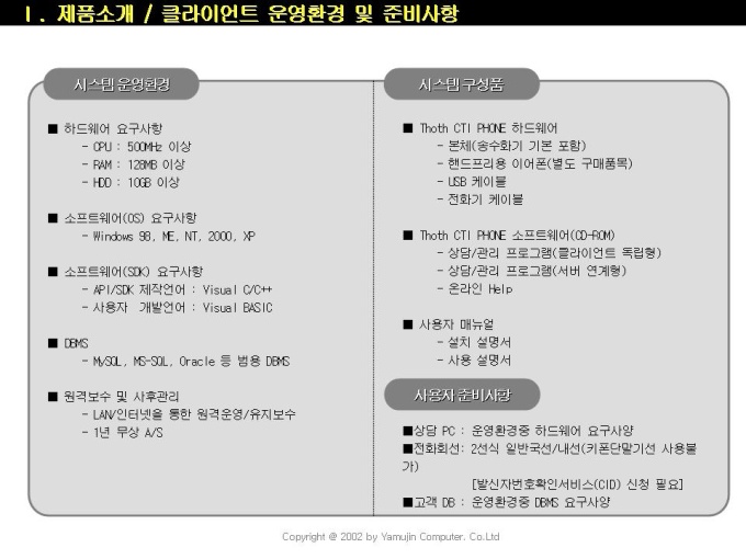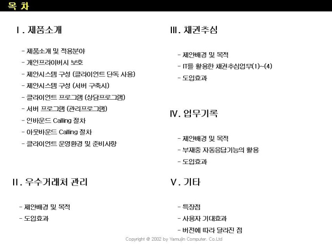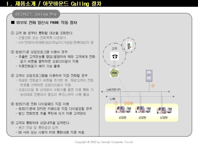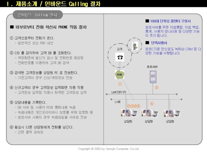 Ⅰ. 제품소개 - 제품소개 및 적용분야 - 개인프라이버시 보호 - 제안시스템 구성 (클라이언트 단독 사용) - 제안시스템 구성 (서버 구축시) - 클라이언트 프로그램 (상담프로그램) - 서버 프로그램 (관리프로그램) - 인바운드 Calling 절차 - 아웃바운드 Calling 절