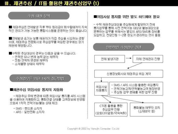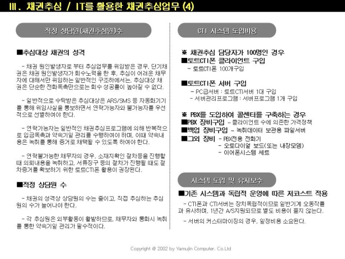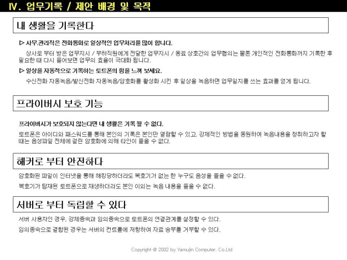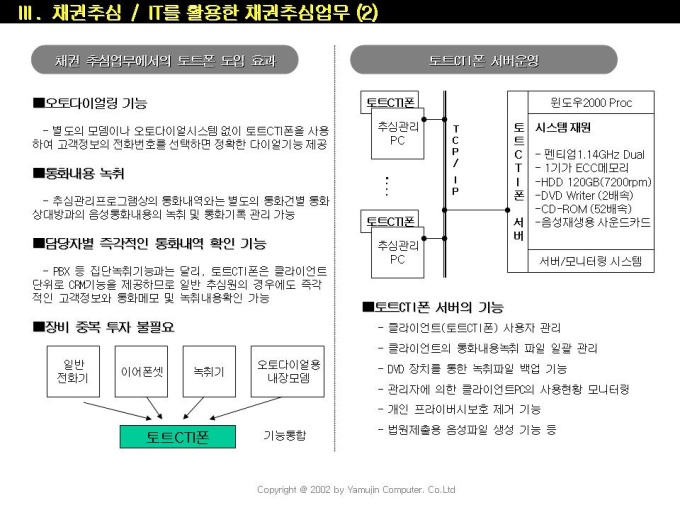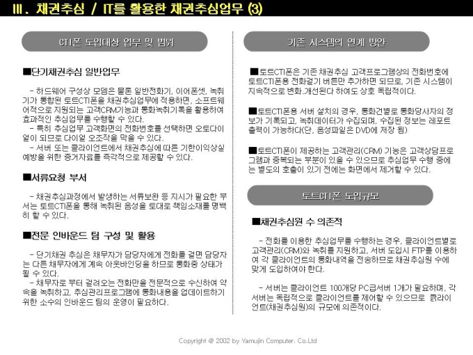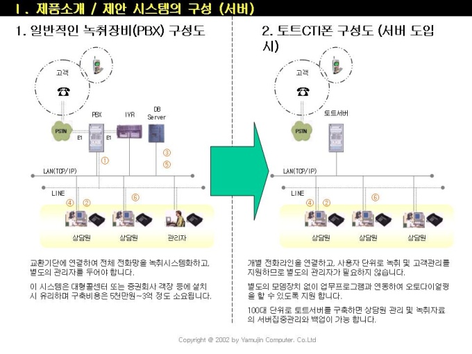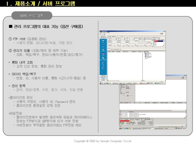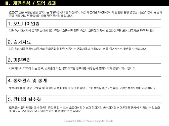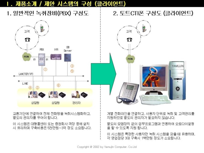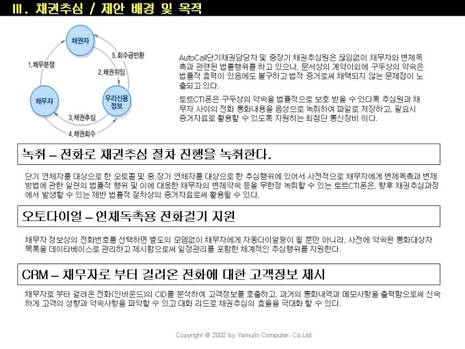 Ⅰ. 제품소개 - 제품소개 및 적용분야 - 개인프라이버시 보호 - 제안시스템 구성 (클라이언트 단독 사용) - 제안시스템 구성 (서버 구축시) - 클라이언트 프로그램 (상담프로그램) - 서버 프로그램 (관리프로그램) - 인바운드 Calling 절차 - 아웃바운드 Calling 절