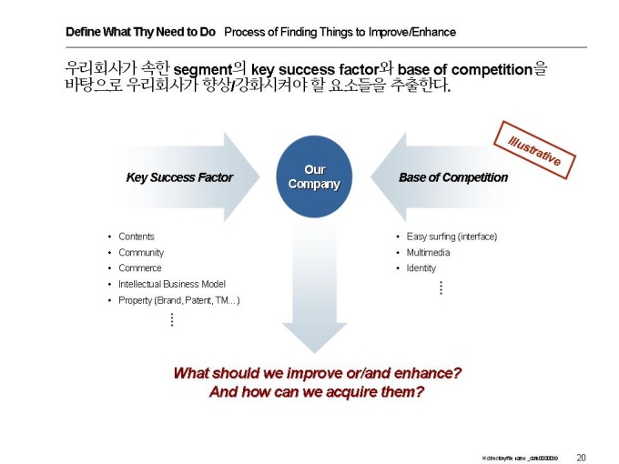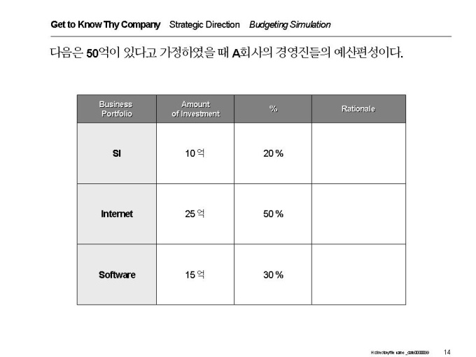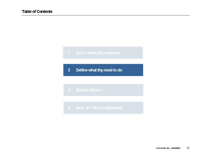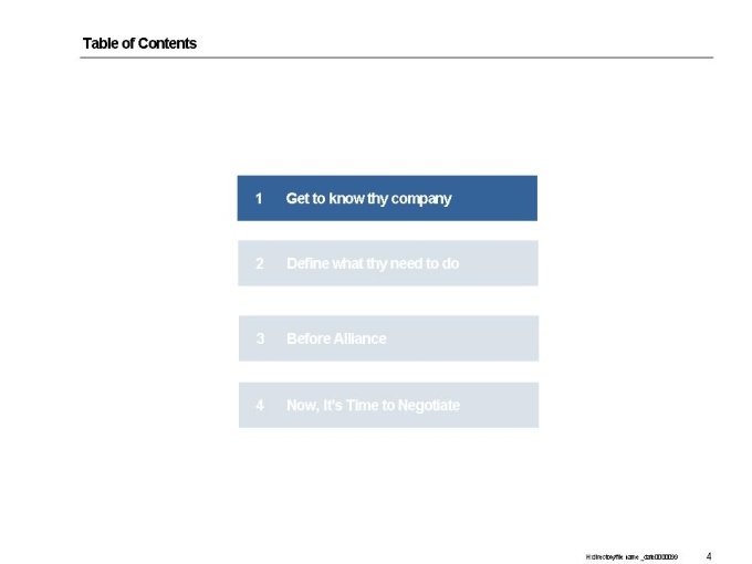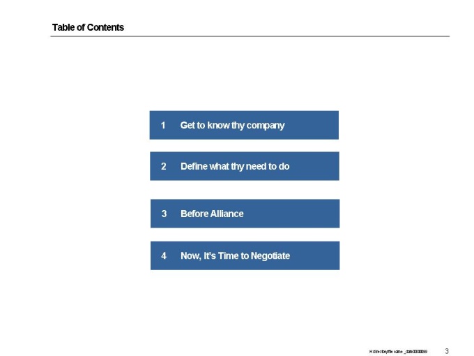 벤처기업이 전략적 제휴,실행을 할 수 있는 정보를 기술하고 있는 제안서입니다. - 목 차 1.Get to know thy company -What to Do -Visioning -Strategic Direction -Segment Attractiveness -Competitive Position -Current Status and Future Target -Potential / Fit -Budgeting Simulation -Soft Issues -Conclusion 2.Define what thy need to do -Process of Finding Things to Improve/Enhance -Finding Things to Improve/Enhance and How to Solve It 3.Before Alliance -제휴파트너 선정시 고려할 사항 선정과정 -전략적 제휴의 위험성 분석 4.Now, It’s Time to Negotiate -Understand the process of Negotiation