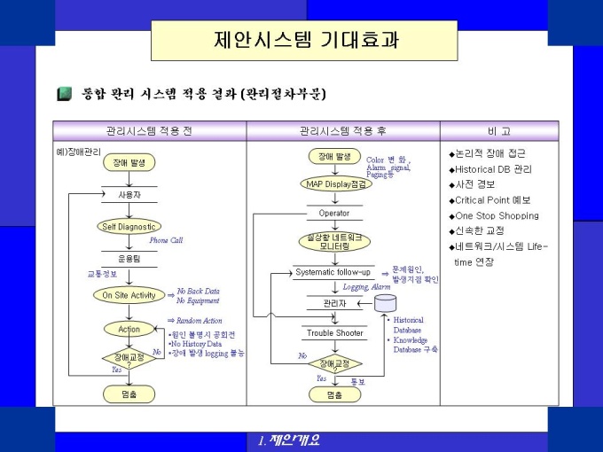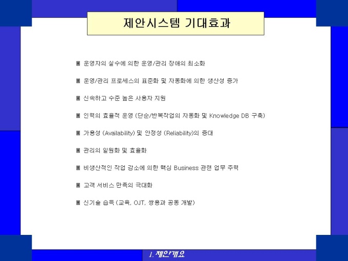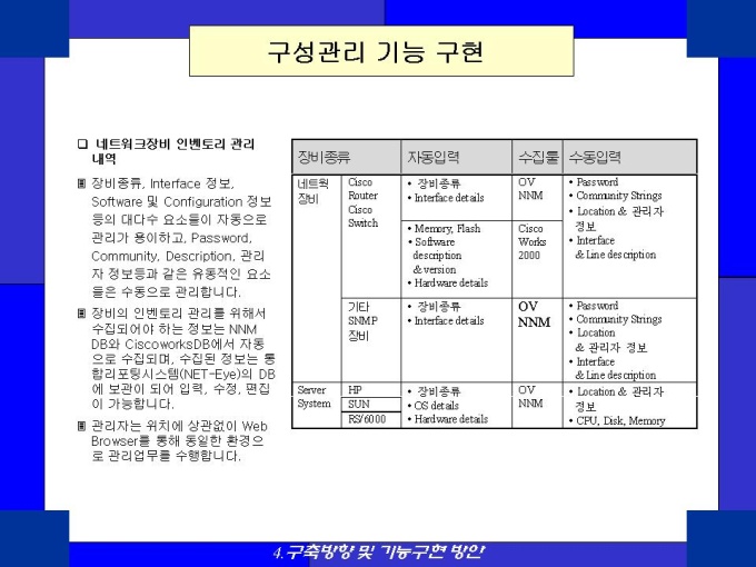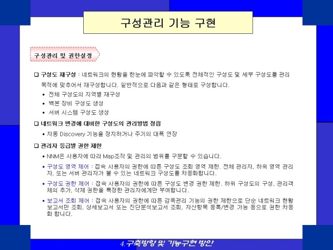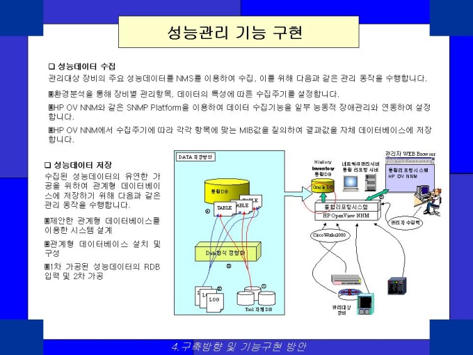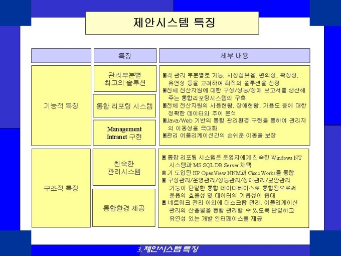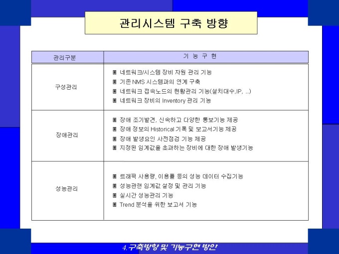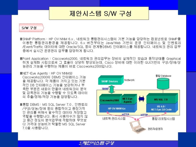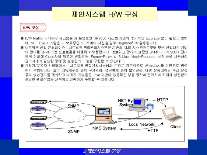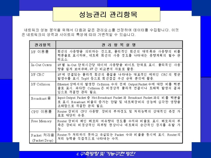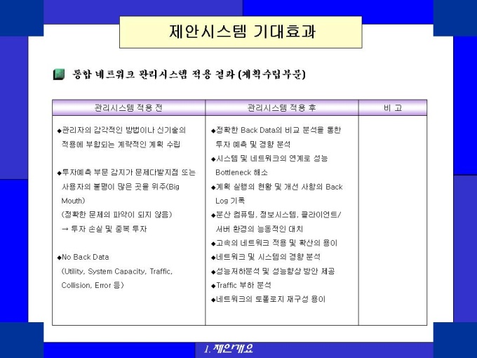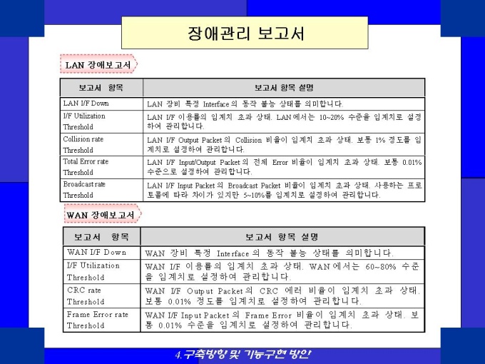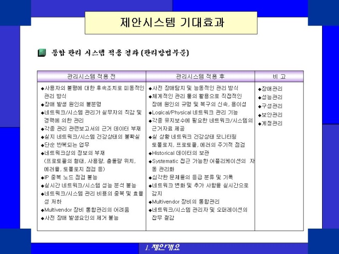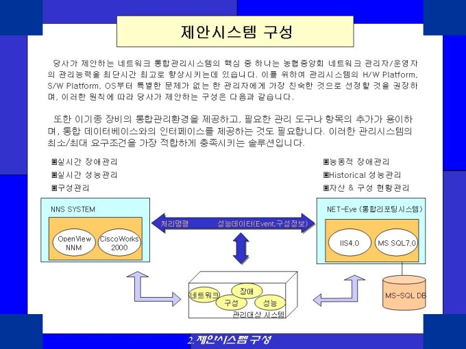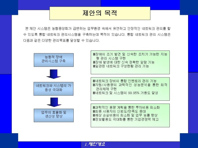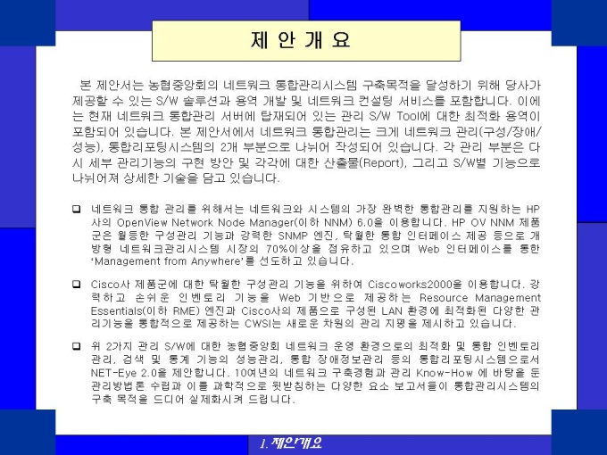 네트워크 구축제안서, 관리제안서 예제 양식입니다. [목차] 1. 제안개요 - 제안개요 - 제안목적 - 제안시스템 기대효과 2. 제안시스템 구성 - H/W 구성 - S/W 구성 3. 제안시스템 특징 4. 구축방향 및 기능구현 방안 - 구축방향 - 구성관리기능 구현 - 장애관리기능 구현 - 성능관리기능 구현 5. 제품 소개 6. 구 축 효 과 7. 지 원 사 항 - 구축일정 - 교육일정