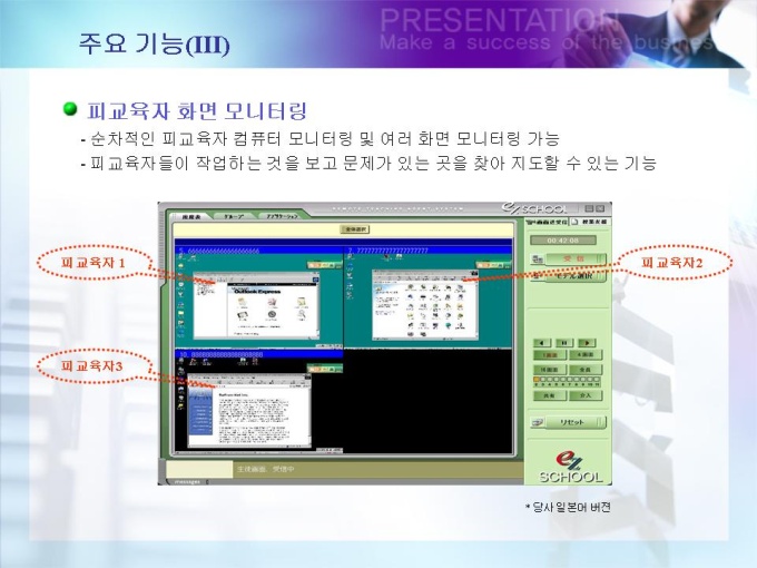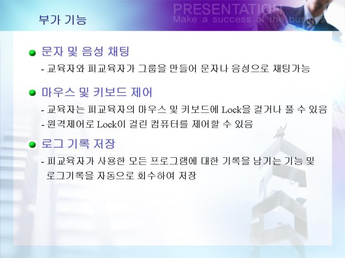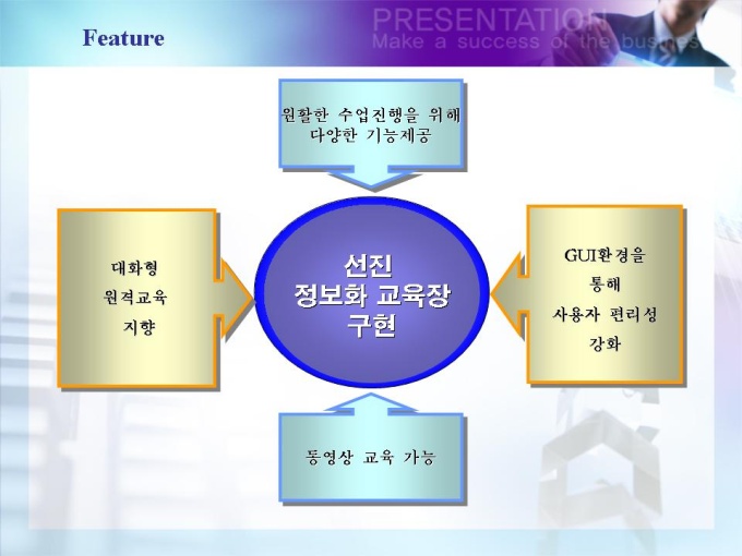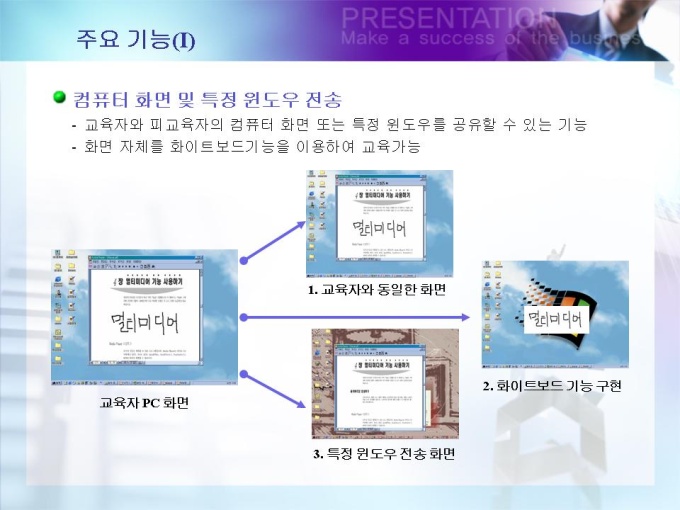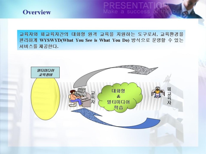 교육자와 피교육자간의 대화형 원격 교육을 지원하는 도구로서, 교육환경을 편리하게 WYSWYD(What You See is What You Do) 방식으로 운영할 수 있는 서비스를 제공입니다.