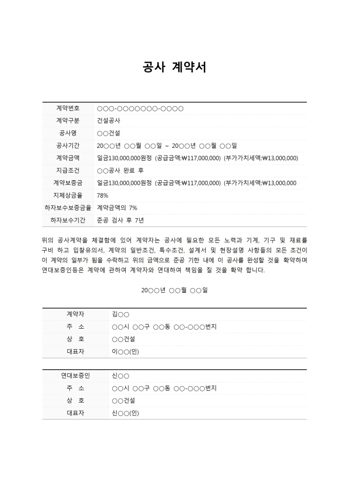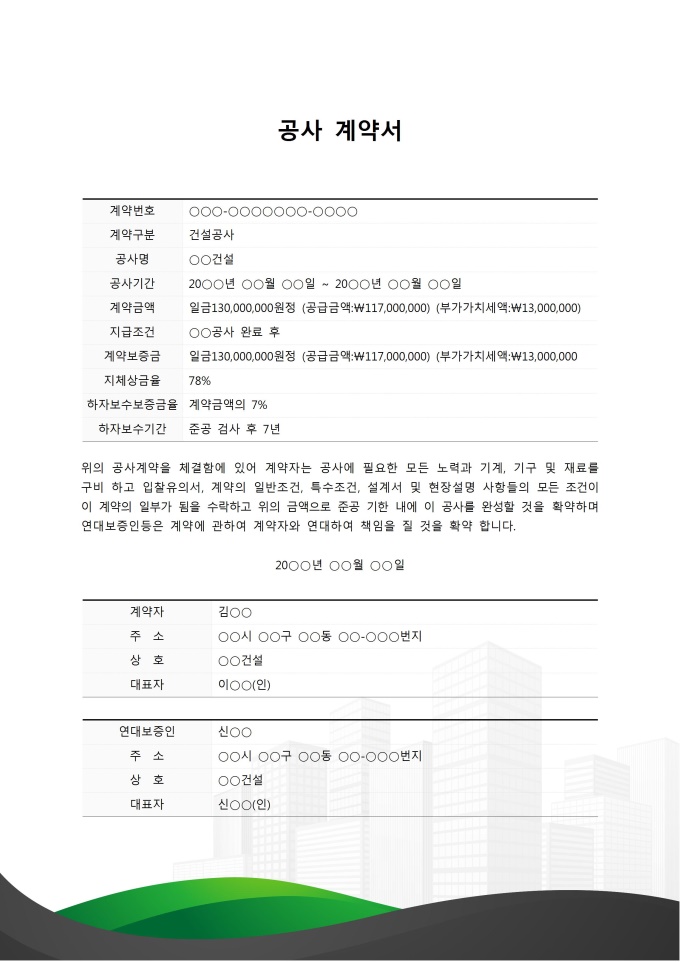 계약자는 공사에 필요한 모든 노력과 기계, 기구 및 재료를 구비 하고 입찰유의서, 계약의 일반조건, 특수조건, 설계서 및 현장설명 사항들의 모든 조건이 이 계약의 일부가됨을 수락하고 위의 금액으로 준공 기한내에 이 공사를 완성할 것을 확약하며, 연대보증인등은 계약에 관하여 계약자와 연대하여 책임을 질 것을 확약한다는 내용은 양식입니다.