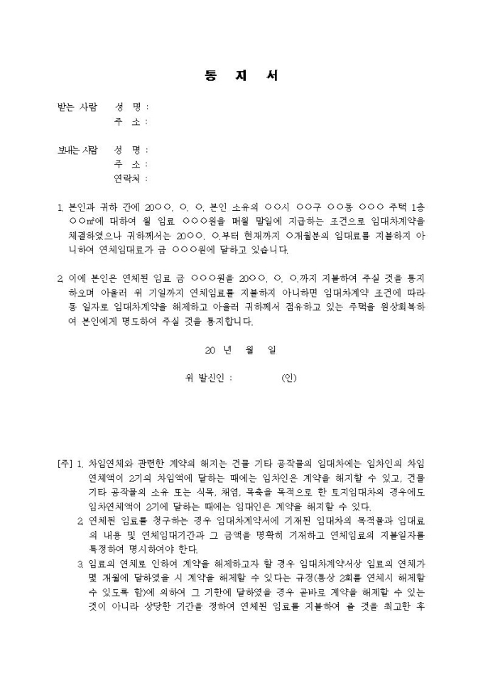 (내용증명)주택임대료에 대한 연체임료청구 및 계약해제를 하려고 할 때
