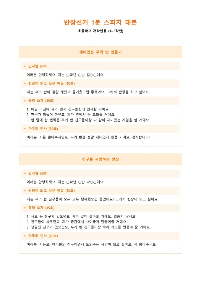 반장선거 1분 스피치 대본 (초등 저학년용)