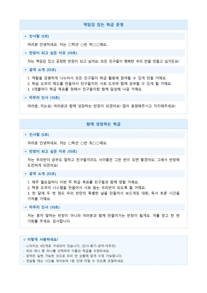 반장선거 1분 스피치 대본 (초등 고학년용)