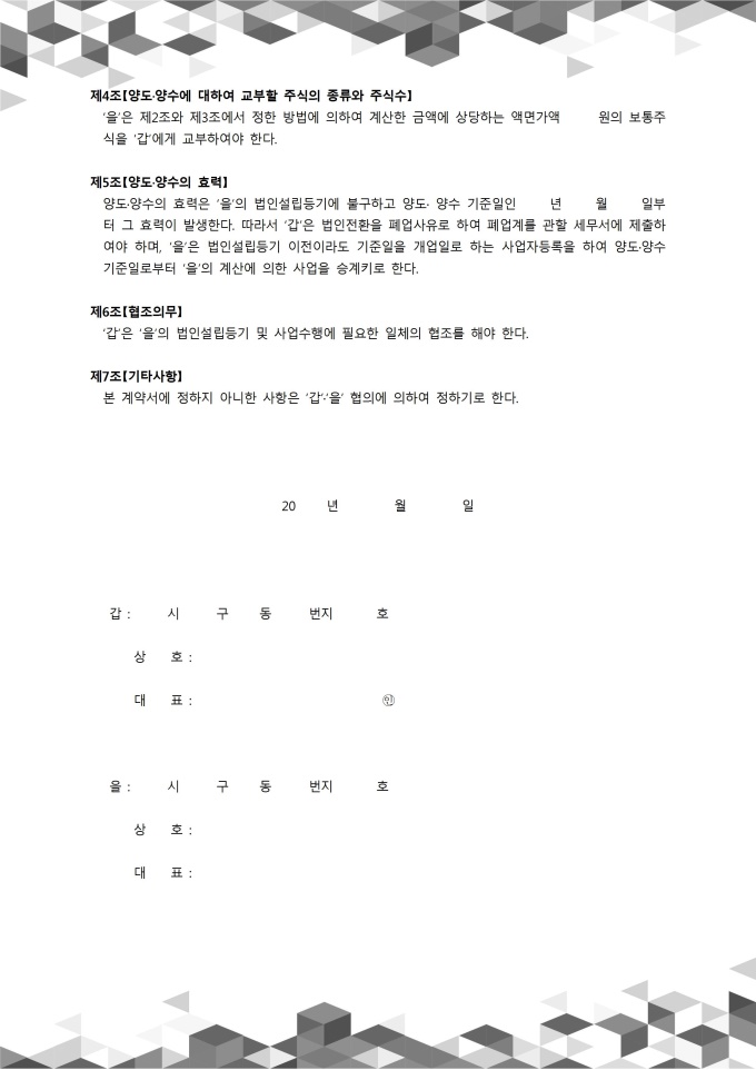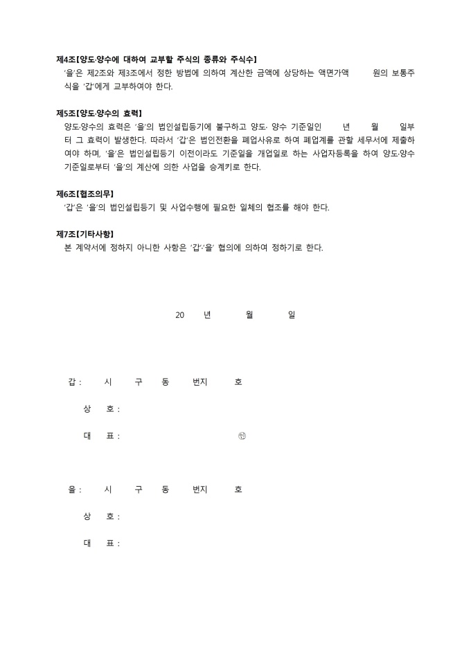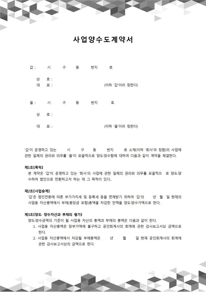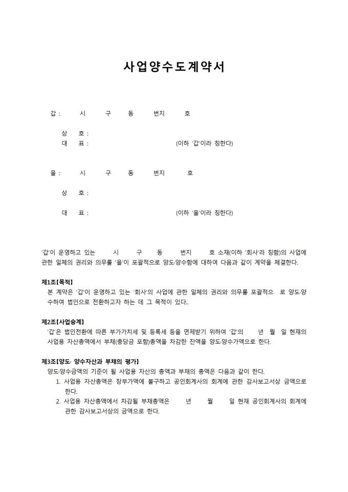 사업양수도계약에 관한 내용이 기록되어있는 사업양수도계약서 샘플입니다.